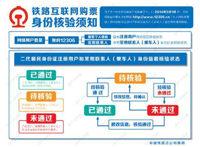據(jù)介紹,實(shí)施身份信息核驗(yàn)后,在12306網(wǎng)站上使用二代居民身份證的注冊用戶和常用聯(lián)系人身份信息將有“已通過”、“待核驗(yàn)”、“未通過”三種核驗(yàn)狀態(tài),使用護(hù)照、港澳居民來往內(nèi)地通行證、臺灣居民來往大陸通行證的注冊用戶和常用聯(lián)系人身份信息將有“已通過”、“請報驗(yàn)”、“預(yù)通過”、“未通過”四種核驗(yàn)狀態(tài)。